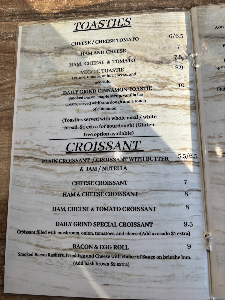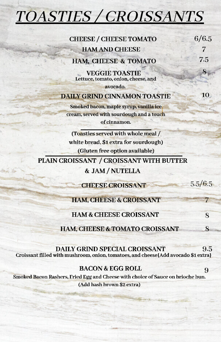 - Toasty Treats: The café offers an array of toasties and croissants, perfect for a quick bite, including the Daily Grind Special Croissant and Bacon & Egg Roll.